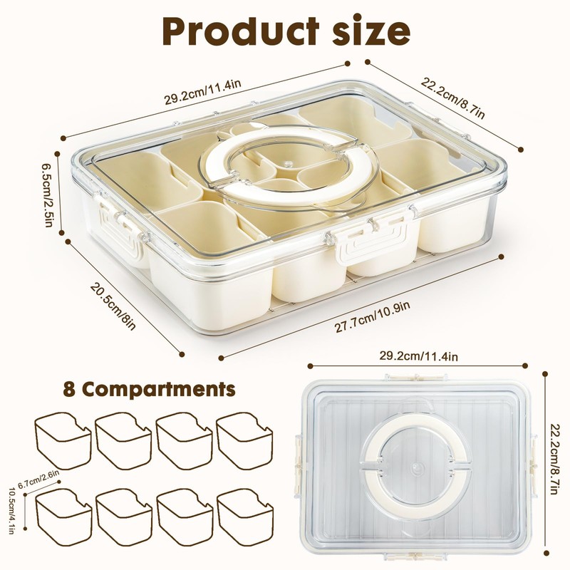 - PORTABLE SEPARATED DESIGN : Snack stay separated and don’t mix,use one tray for variety of nuts, one for fruits, one for cheeses and others,8 compartments give you more choice to storage. You will be love pack multiple items in it and take it on the go. You will also like if one kid wants one thing and another kid wants something else, they can take the cups out. Makes you look like have snack game together.