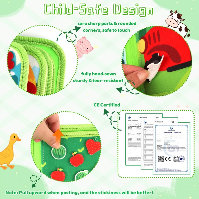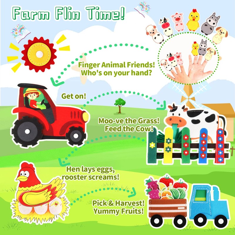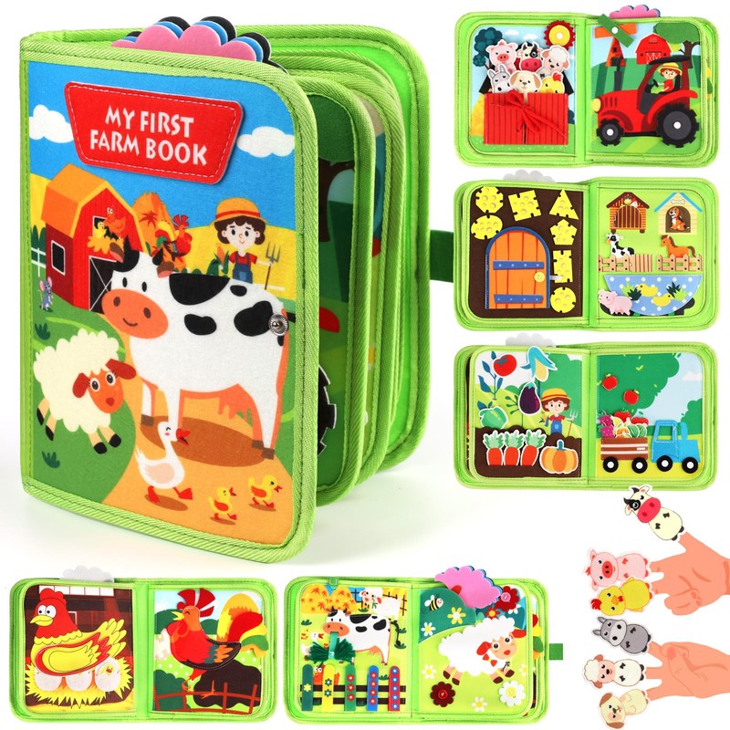 - 👕⏰Life Skills Development & Educational Play: This busy book for toddlers is more than a toy, it's a learning journey! Designed for 1-4 year olds, it combines fun with practical skills: mastering clothing fasteners (buttons, zips), learning about animals / crops through the farm theme. Farm animal activities and vibrant illustrations promote cognitive development, vocabulary building and problem solving skills, while building early awareness of nature and everyday life