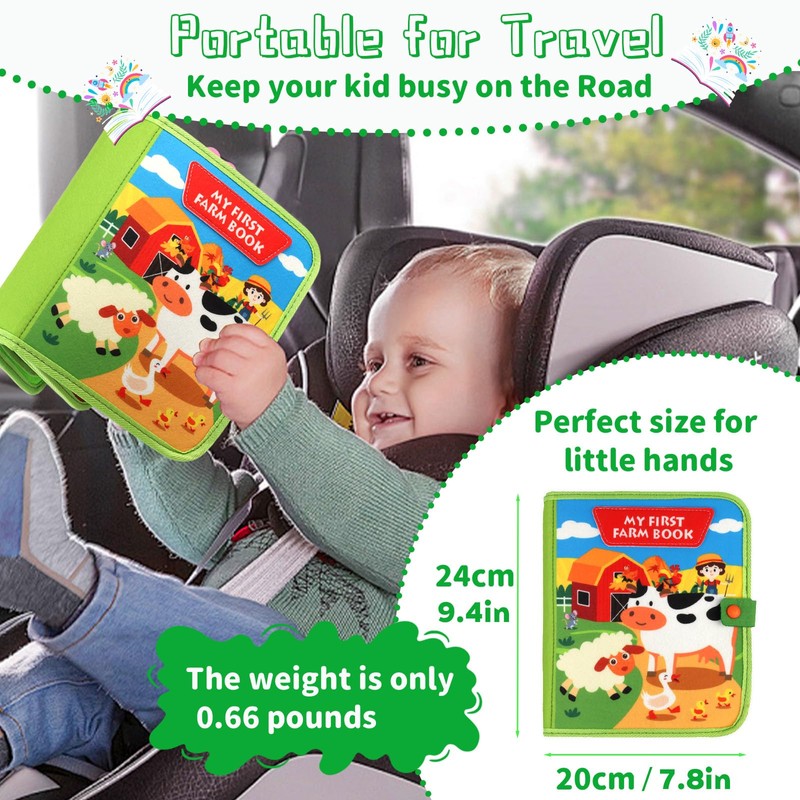 - 🚗✈️Portable Travel Toys, Fun Anytime, Anywhere: Measuring 9x7.87x2.36 inches and weighing only 0.3kg! Compact enough to easily fit in a pram or carry-on luggage, it's a must-have for self-driving, air travel or restaurant meals. Keep toddlers focused and quiet on the go with interactive farm scenes - no mobile phone screen required! It a versatile busy book that transforms any moment into an opportunity for learning and play, whether at home or on the go
