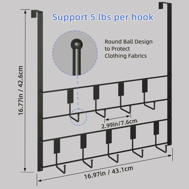 - Over the Door Hooks: The 9 hook door hanger provides maximum space for hanging items, and the ball design on the top of the hooks prevents delicate items from getting snagged or pulled
