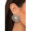 Shimmery strands of silver spin out from a white pearly center, creating an exaggerated firework-like display at the ear. An explosion of dainty iridescent rhinestones, dainty white pearls, and white rhinestones lines the swirls and curves of the shimmery display, creating an eye-catching display. Earring attaches to a standard post fitting. Due to its prismatic palette, color may vary.
