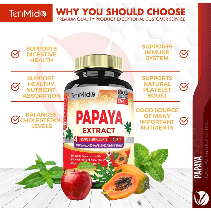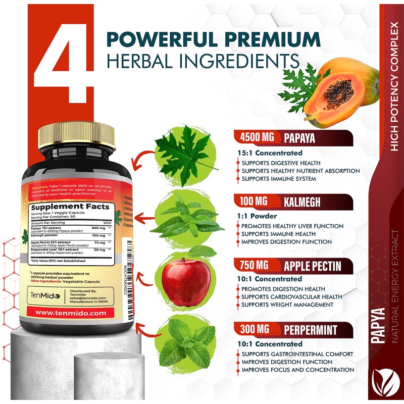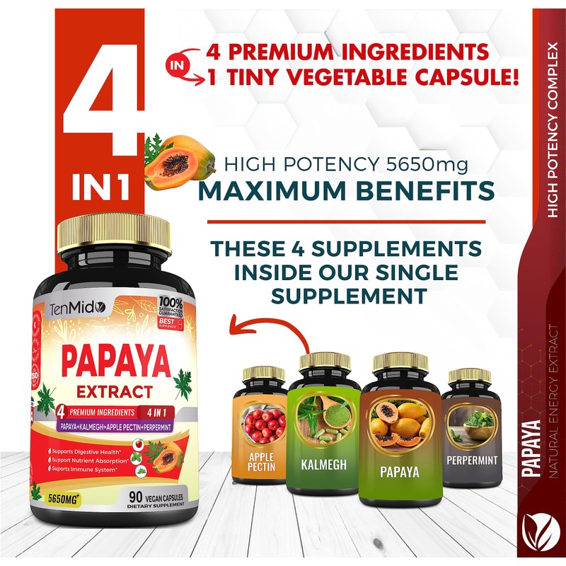 - ❤️ High Potency Complex: Tenmido Papaya Extract Capsules combination equivalent to 5650mg of the highest quality Papaya powder with 3 extra powerful herbal problematic ingredients: Kalmegh, Apple Pectin, and Peppermint. With the special optimized formula, our product has been shown to be one of the most advantageous herbs, highest absorption and bioavailability for your overall health.