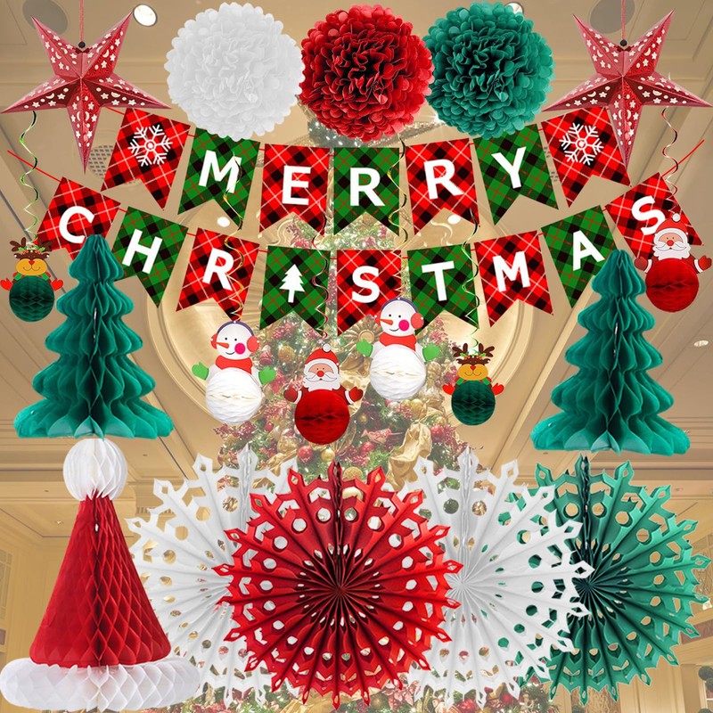 - 【20pcs Merry Christmas Decorations】-The 20pcs Christmas bunting set has 1pc banner with‘Merry Christmas’printed on it, 1pc Christmas confetti bunting,2pcs paper stars,2pcs paper Christmas trees,4pcs paper snowflakes, 1pc Christmas hats,3pcs Christmas honeycomb balls and 6pcs hanging honeycomb Christmas decorations.These quantities are enough for you to decorate your Christmas party and have a perfect holiday.