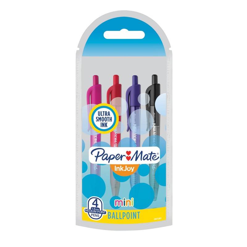 Find joy in small packages! Paper Mate ink joy mini retractable ballpoint pens may be small, but they make a big color impression. Featuring the ultra-smooth Paper Mate ink joy writing system, these super-cute pens feature four vibrant shades to add a pop of color to notes and more! the compact size is perfectly portable and goes wherever ideas Strike. Mini pens come with a re-sealable pouch for neat storage. Spread joy with Paper Mate ink joy!