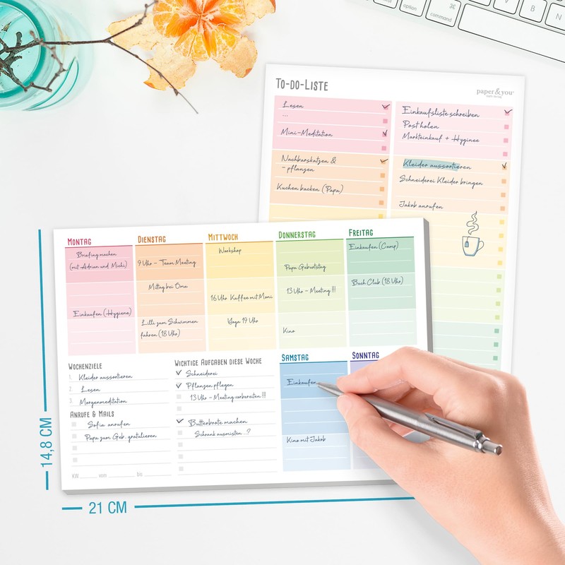From shopping list to to-do list to weekly schedule - every organisational need is taken care of. For notes, tick and untick, fill in and remember, here are the tools and layouts that should not be missing in everyday life.