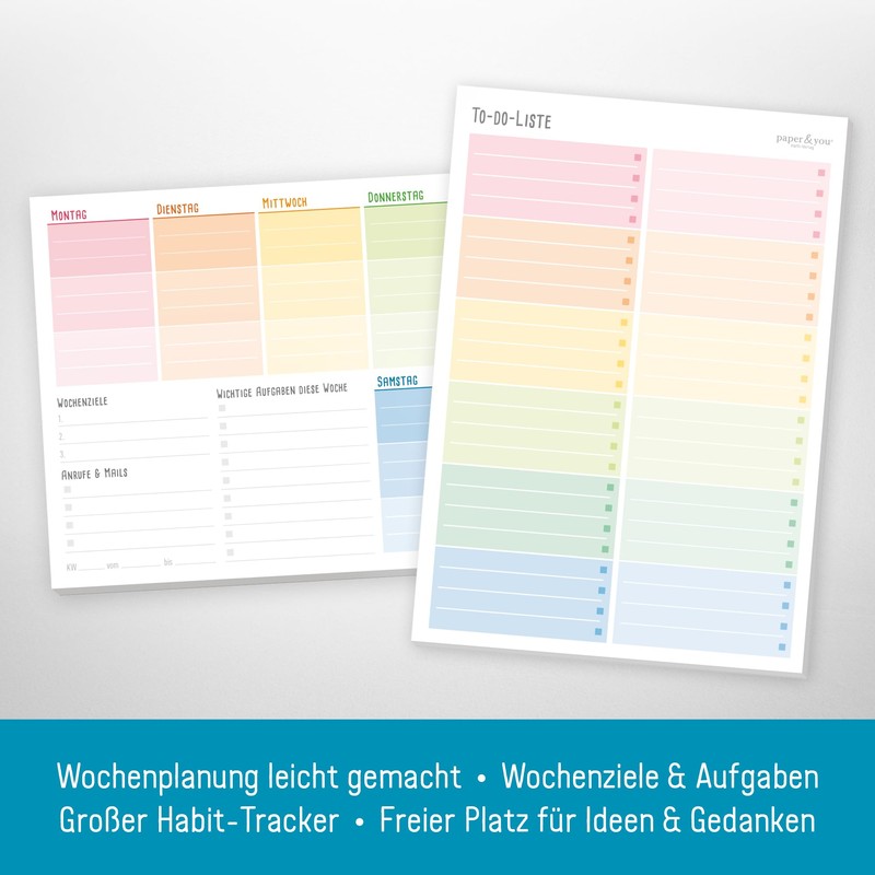paper&you® Set of 2 A5 To-Do Lists Pad & Weekly Planner [Rainbow] | 2 x 50 Pages - Includes Space for Notes on Front and Back