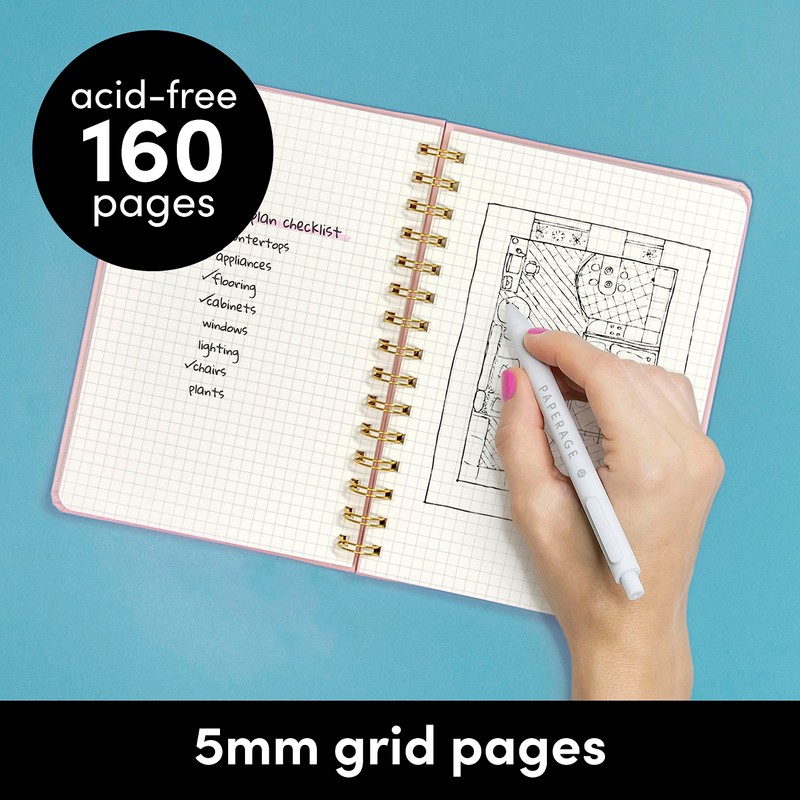 - HARDCOVER SPIRAL JOURNAL: This medium 5.5 in by 8 in graph paper spiral notebook features durable and water-resistant vegan leather cover, rounded corners, 160 pages, inner expandable pocket, sticker labels, ribbon bookmark & elastic closure band.