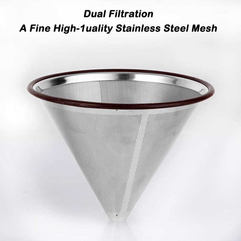 - DOUBLE STAINLESS STEEL MESH- High-quality 304 stainless steel with dual filtration: a fine high-quality mesh on the inside, and a laser-cut filter on the outside. This design prevents any grounds from getting in your coffee, while allowing the oils and nutrients to pass through to your cup, ensuring a better tasting cup of coffee.