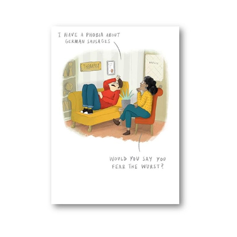 - AMUSING UNIQUE DESIGN: featuring a comical, illustrated design of somebody in a councelling appointment saying "I have a phobia about German sausages", and the therapist asking "Would you say you fear the wurst?". The card comes with a coordinating envelope.
