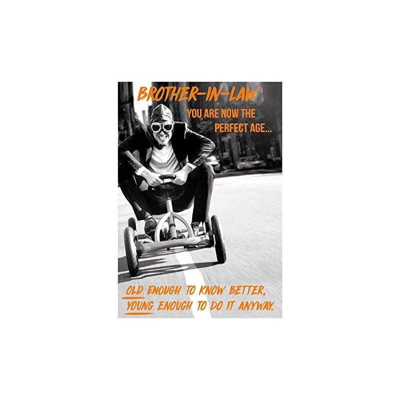 - UNIQUE HUMOROUS DESIGN: featuring a black and white photograph of a man wearing pilot goggles and a suit, whilst racing in a go-kart, with a "Brother-in-Law you are now the perfect age... Old enough to know better, young enough to do it anyway" message on the front. The card comes with a coordinating envelope.
