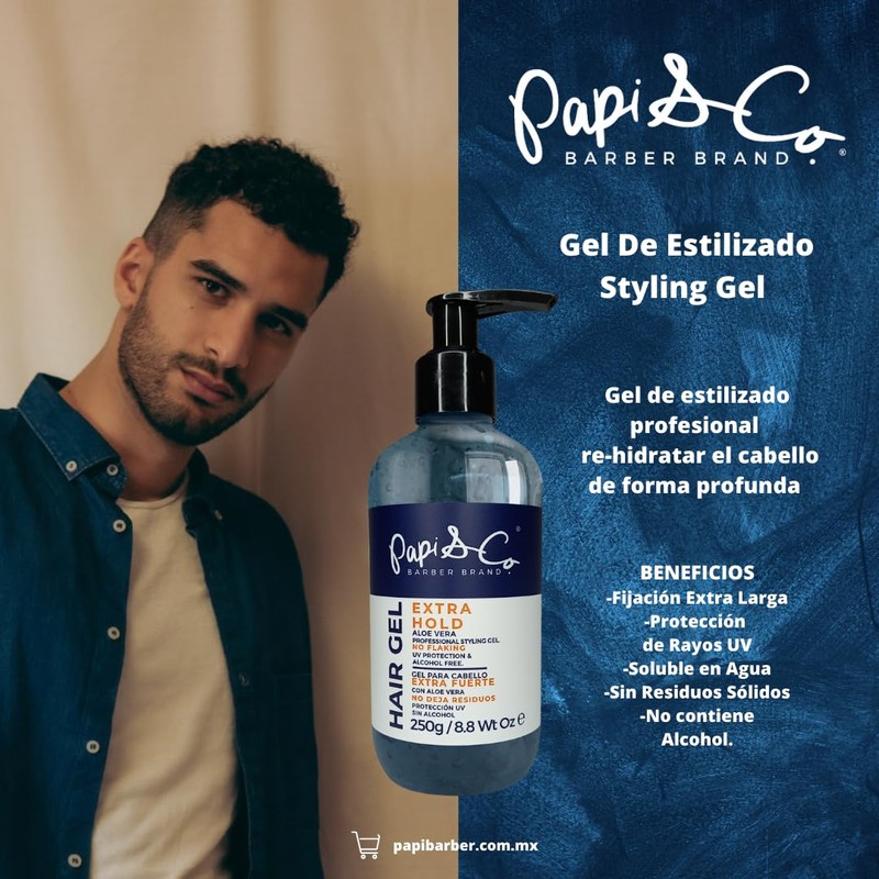 BENEFICIOS Gel de estilizado profesional con ingredientes naturales para re-hidratar el cabello y mantenerlo sano. – Fijación profesional extrema. – No genera residuos. – Protección de calor.