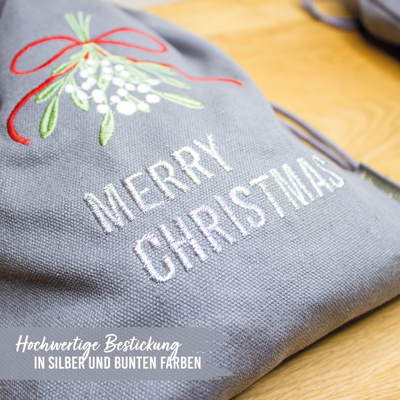 You will receive cotton gift bags with Christmas embroidery – ideal for wrapping gifts – size 20 x 30 cm – with drawstring.