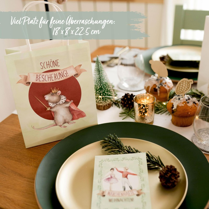 Papierdrachen 6 Colourful Printed Gift Bags for Christmas - Nutcracker - 22 x 18 x 8 cm - Includes Christmas Cards - Christmas Gift Packaging - Handle Bags Set of 6