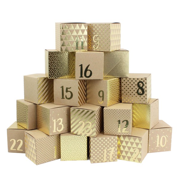 Papierdrachen DIY Advent Calendar for Filling – 24 Boxes for Crafts – Gold Foil Motif – 24 Natural Brown Boxes Made of 400 g/m² Cardboard for Standing and Decorating – 24 Boxes – Christmas
