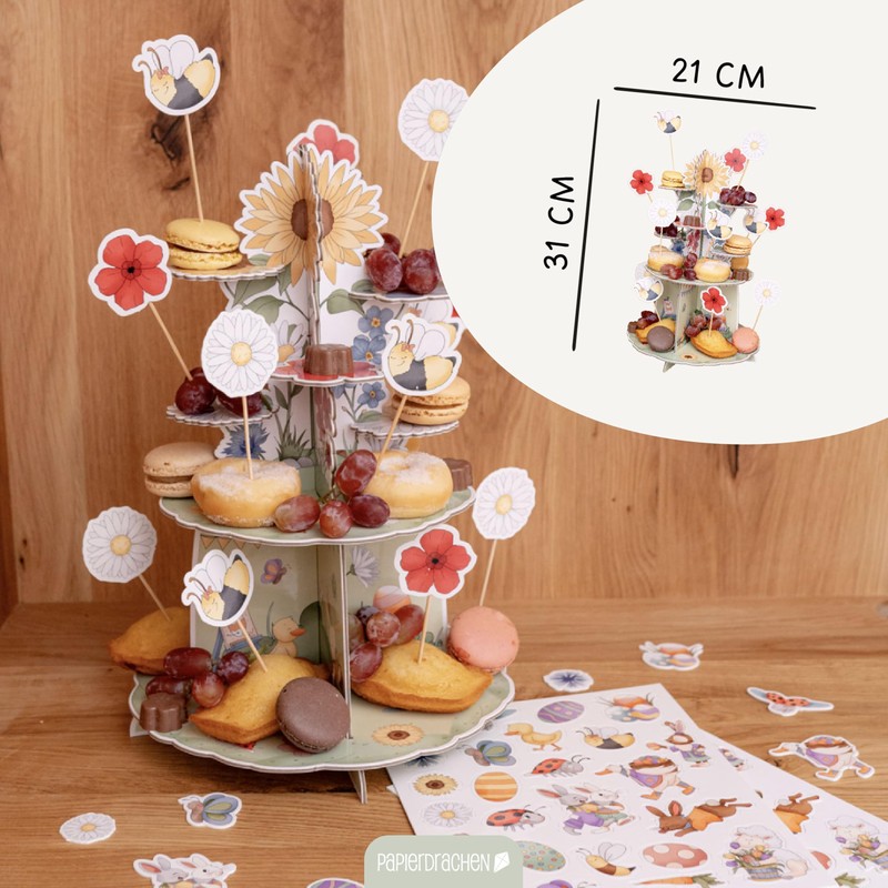 Whether sweet or savoury, with this cake stand you can present your delicacies in a stylish way. Small appetizers, cupcakes or even savoury snacks find their place on the generous levels. With a height of 31 cm, there is enough space for all your treats. Thanks to the clever plug-in system, the cake stand is not only easy to assemble, but also to store away to save space – and best of all: it is reusable every year!