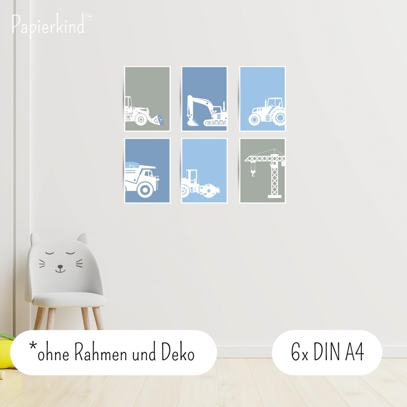 Papierkind™ Set of 8 Posters - Construction Vehicles | A4, Without Frame (6, B13 Greyish Green, Dark Blue, Light Blue)
