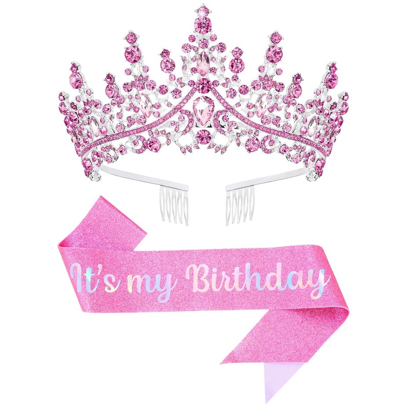 Papoopy Birthday Tiara and Crown with Sash, Birthday Tiara for Women Birthday Party (Pink)