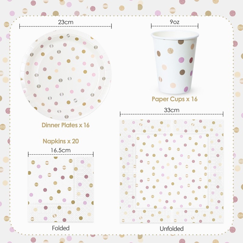 - 52 Stück Papierteller und Servietten mit Papptassen: 16 x klein Pappteller 18 cm, 20 x Papierservietten 33 x 33 cm 16 x Papierbecher 9 unzen.
