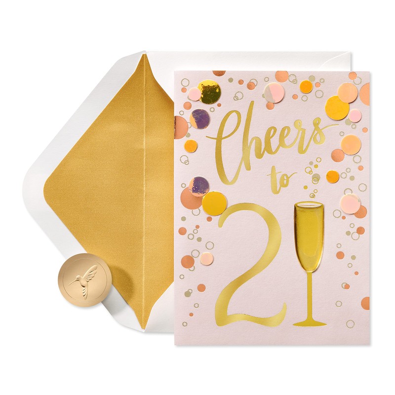 • This 21st birthday card by Papyrus features a beautiful design embellished with shimmering foil, sequins and epoxy
