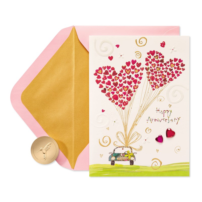 - This cute anniversary card by Papyrus features beautiful details including embossing, shimmering foil and gem embellishments