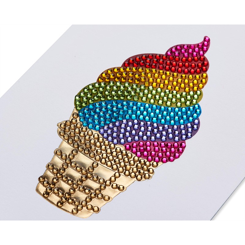 Make birthdays extra festive with this sweet Papyrus card featuring a dazzling ice cream cone encrusted with colorful gems. Assorted and intricate gem detailing add a lavish touch. This unique birthday card design is finished with an insert sheet with full color greeting. Comes with a coordinating envelope, gold Papyrus hummingbird seal and a protective cello sleeve.