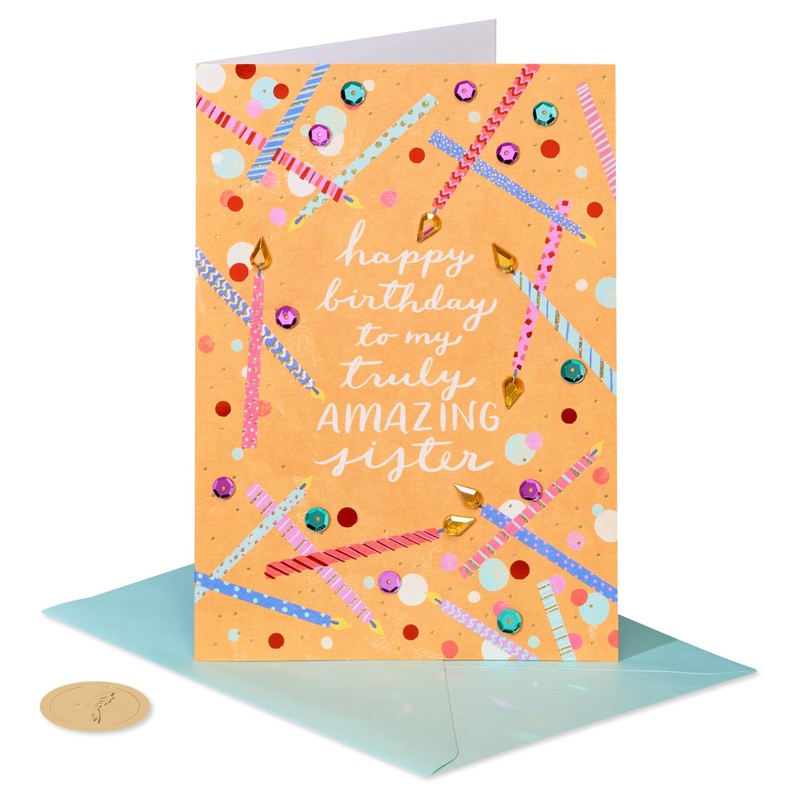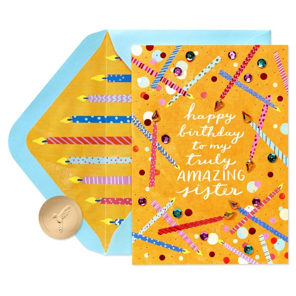 - This Papyrus birthday card includes a stunning design featuring foil accents, sparkling gems, and sequins on a vibrant, textured background