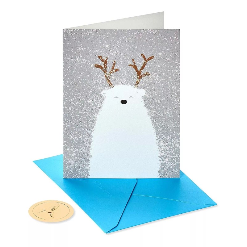 Mensaje interior: Wishing you the happiest and merriest of holiday seasons!; Esta caja con tarjetas de felicitación navideñas de Papyrus incluye 20 tarjetas, 20 sobres de color rojo y 20 sellos dorados.; Las tarjetas miden 3.75 x 4.75 pulgadas.; Las tarjetas de festividades de Papyrus cuentan con un adorno de Mickey Mouse y purpurina negra, sobres de colores y sellos dorados en una atractiva caja roja con una tapa protectora transparente.; Sobres incluidos, no incluye los sellos para el envío postal. Un divertido oso polar con cuernos de venado añade calidez y fantasía a esta tarjeta de Navidad de Papyrus adornada con purpurina brillante. Este juego de 20 tarjetas incluye sobres a juego, sellos dorados de colibrí de Papyrus y una caja con tapa de acetato. Papyrus ofrece artículos de papelería de primera calidad, como tarjetas de felicitación, envolturas, bolsas de regalo y otros productos divertidos para cualquier ocasión y todas las temporadas festivas, todo con diseños únicos y adornos de calidad. Todos nuestros productos estan en inglés SKU 14072218307