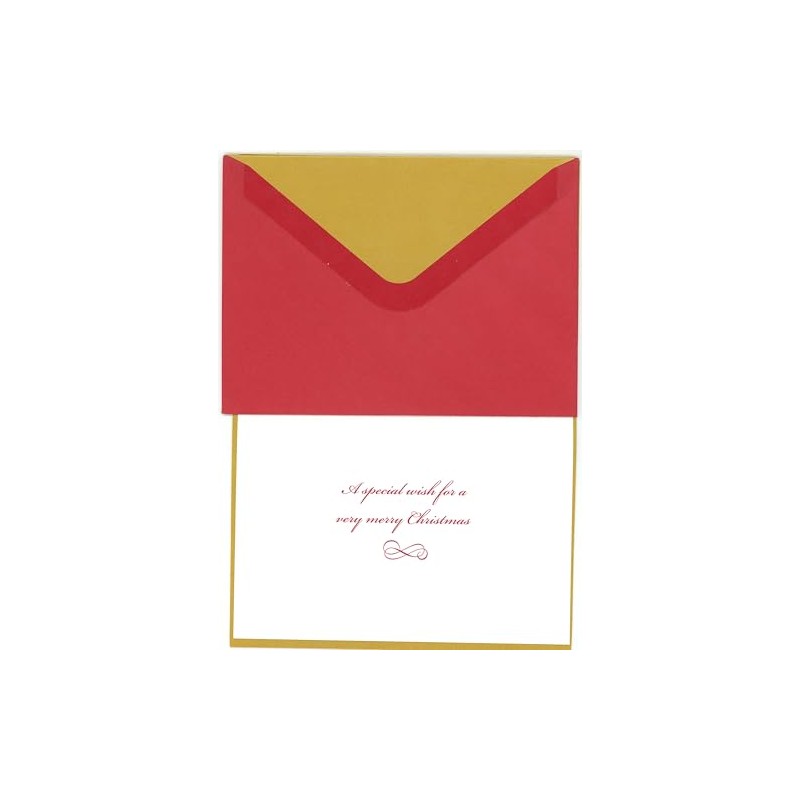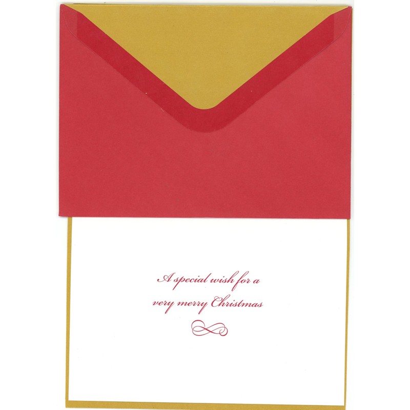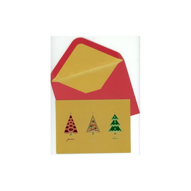 - Papyrus Merry Christmas Trees Card Front: peace, joy, love. - (3 Trees: Red, Gold, Green Foil with Gems) Sentiment inside: A special wish for a very merry Christmas. Size: 7" x 5" Red Envelonpe with Gold Liner.