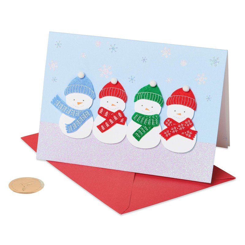 - These festive Christmas cards by Papyrus features playful snowmen with paper attachments, felt, pom-poms, and glitter