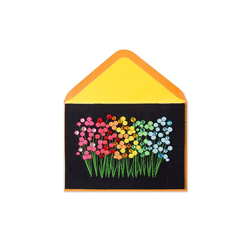 - Bold embroidered flowers in rainbow hues are embellished with round gems and set against a black fabric background on this cool blank card.