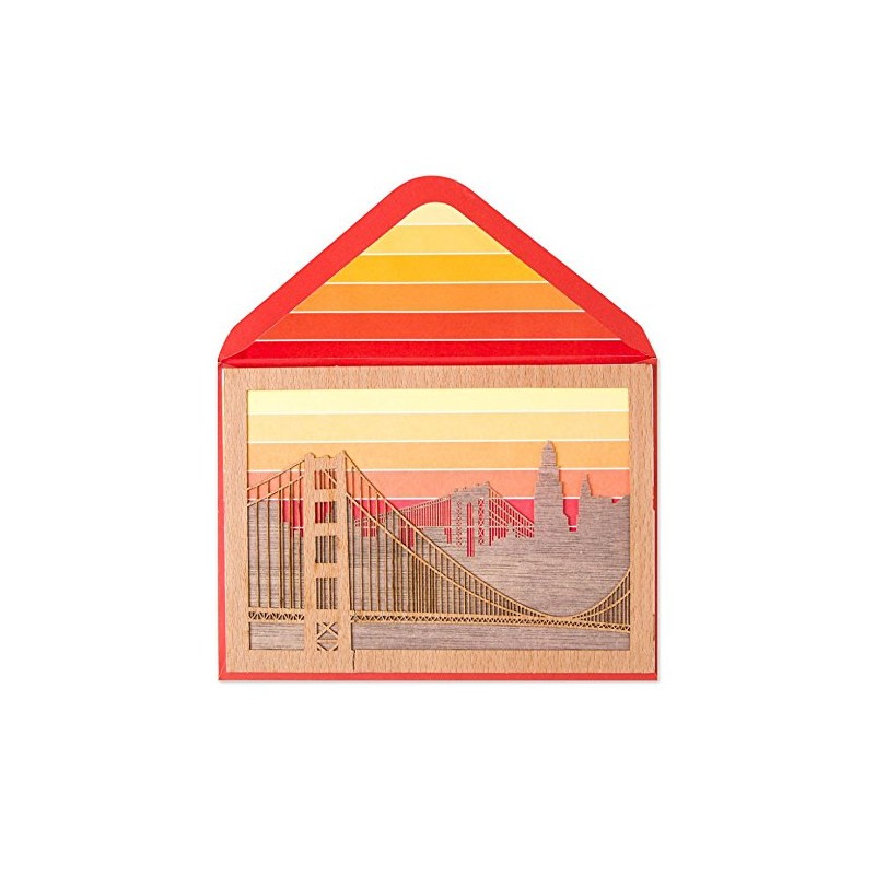 • A cityscape and bridge silhouette is depicted with a wood lasercut and paired with an orange and yellow sky. A reflective quote from Ralph Waldo Emerson is featured inside this birthday card.