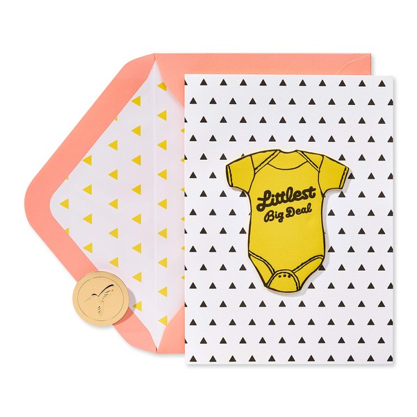 Welcome the “Littlest Big Deal” to the world with this premium Baby Congrats card from Papyrus Gender-neutral design and color palette are perfect for the “new boss” whether it’s a baby boy or girl. Premium embellishments include fabric, felt, stitching, and layered paper attachments. Fresh, fun message conveys warmth and congrats Peach envelope with yellow patterned lining and unique Papyrus gold seal included. Extra postage required.