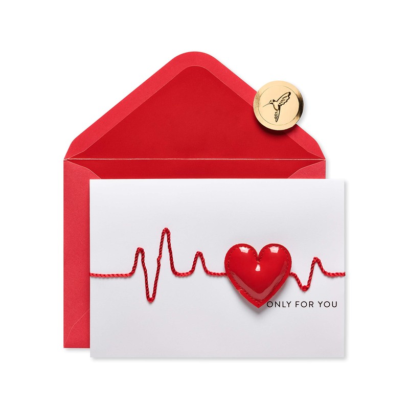Here’s a Valentine’s Day card for the person who makes your pulse race. The heartbeat design on this premium Papyrus card features lots of extras including a cord, stitching, dimensional paper, metallic foil, and vinyl accents as it tracks the effects of romantic love. Tell them they’re in your heart with a fun and unique design exclusively by Papyrus!