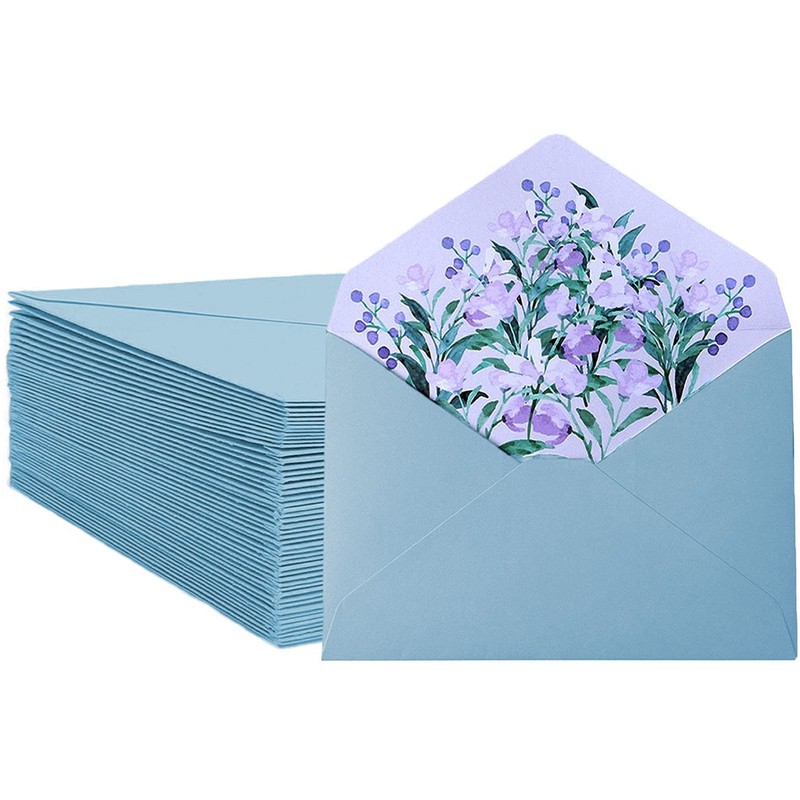 Paquete de 50 Sobres florales de invitación, sobres de 6.3 × 4.5 pulgadas para invitaciones con forro floral morado para bodas, cumpleaños, graduación, baby shower