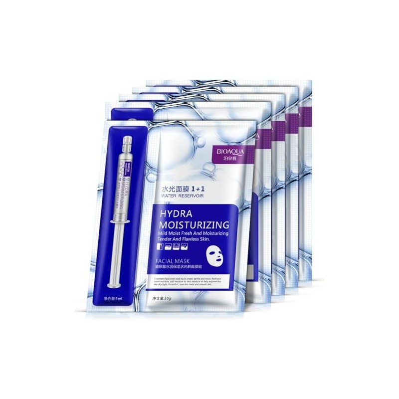 - Paquete Hidratante Mascarilla Facial y Serum Esencia Ampolleta Acido Hialuronico Rejuvenecedor Hydra Moisturizing Cuidado Facial Skin Care Set Completo Bioaqua Dúo Suero Ácido Hialurónico + Mascarilla Facial Peso: 30 g, 5 ml. Contiene un tubo de esencia concentrada de ácido hialurónico + una mascarilla facial de suero de ácido hialurónico. Contiene ácido hialurónico, que hidrata profundamente la piel, mejora la condición de la piel seca, hace que la piel luzca suave e hidratada y devuelve la vitalidad a tu rostro. Aplica la mascarilla para hidratar y suavizar la piel. Aplica la esencia hidratante para nutrir y embellecer la piel de tu rostro. Es suave, nutritiva y adecuada para pieles delicadas. Características: