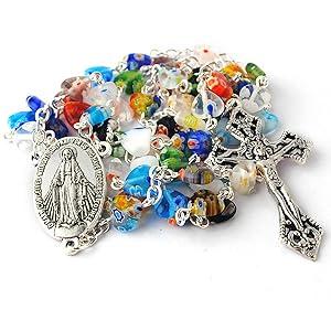 - Multicolor heart beads rosary center piece is Mirauclous in Anti-silver plated, the Crucifix is Zinc Alloy with anti-Silver plated,