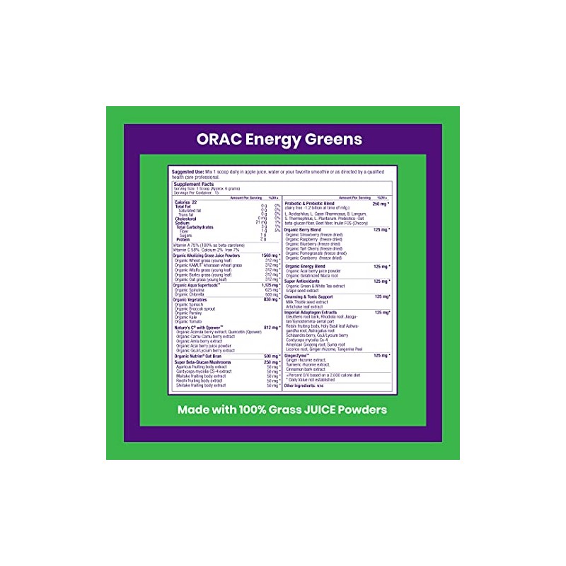 - OVER 40,000 TOTAL ORAC PER SERVING ORAC ENERGY GREENS: Provides the antioxidant power of more than 24 servings of fruits & vegetables in every scoop. In addition, our ecologically wild crafted herbs can go beyond organic by helping promote fair trade while keeping the environment pure by providing indigenous people the opportunity to make a living without clearing natural landscapes or cutting down rainforests.**