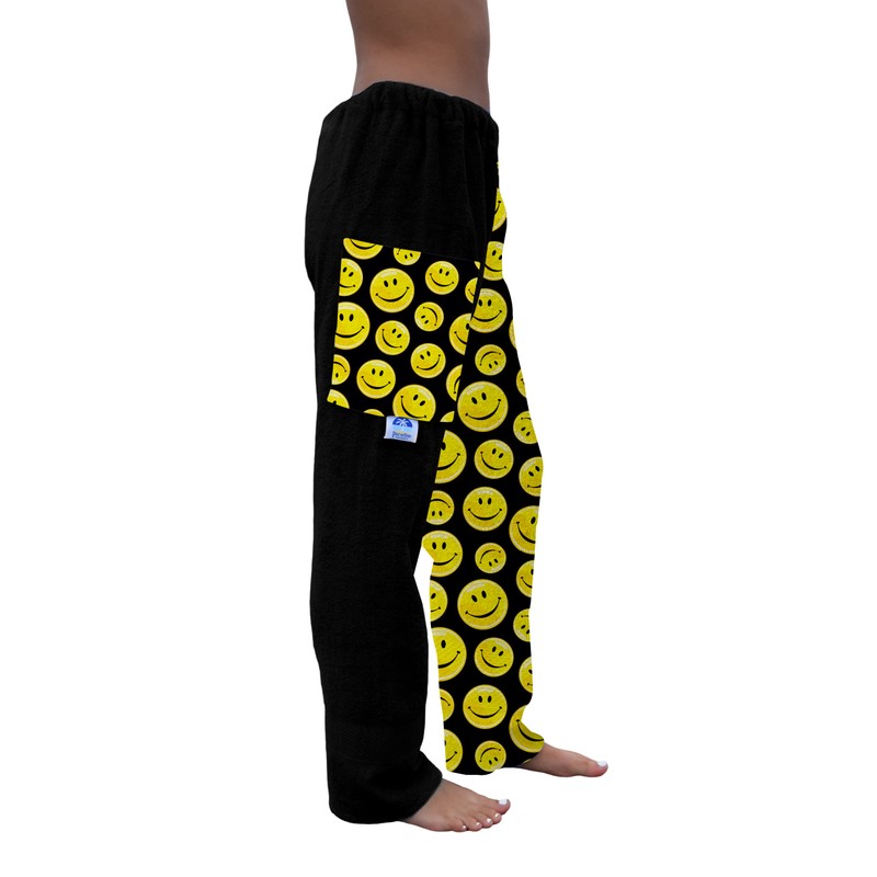 Paradise Towelwear Towel Pants for Swimmers – Cotton Terry Cloth Towel Pants – Beach Coverup – Resort Wear – Swim wear - Black Yellow Smiley Face (Size Adult S)