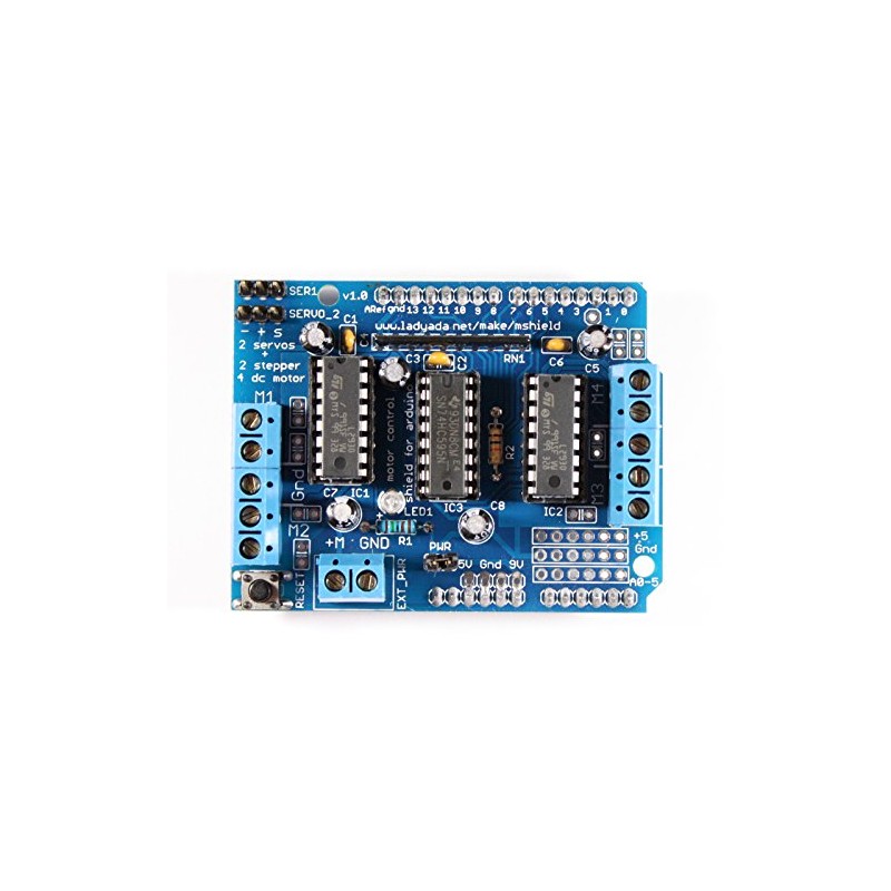 It allows you to control up to 4 DC motors, 2 stepper motors or 2 servos using your Arduino Uno, Arduino Mega or compatible board.