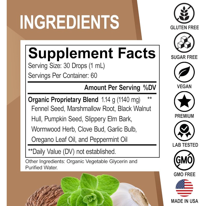 - Natural & Organic: Our non gmo ParaGuard liquid drops tincture blend has organic oregano oil, black walnut wormwood clove, fennel, marshmallow, slippery elm, garlic & peppermint leaf for ph gut health