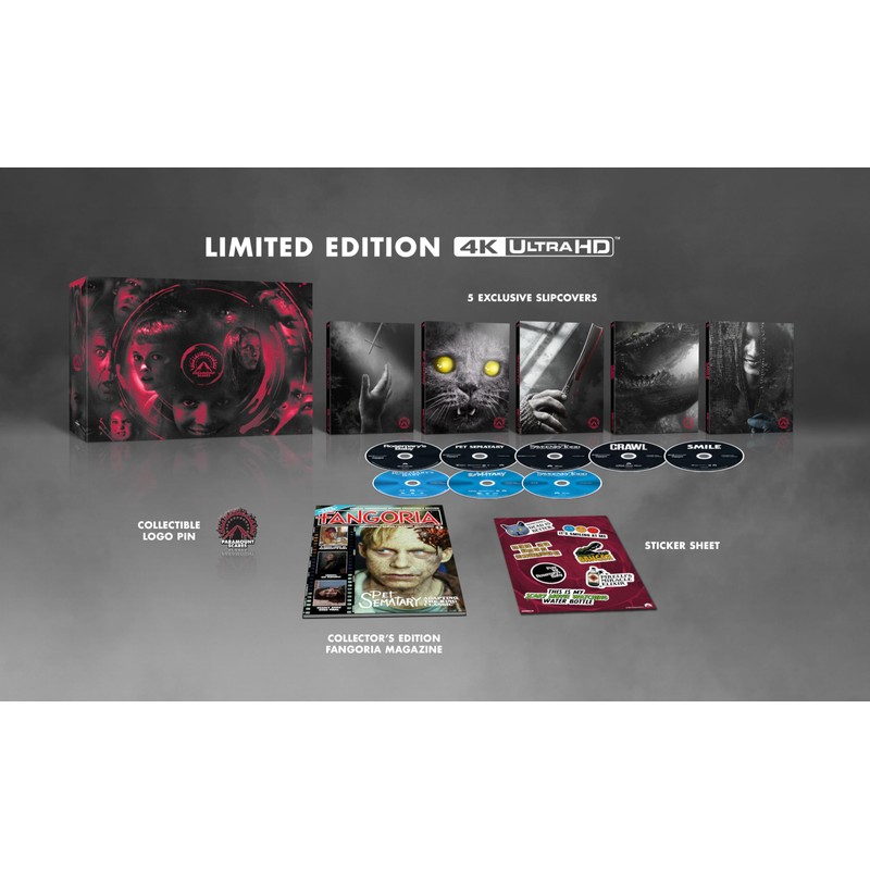 Fans can plumb the depths of the horror genre with this collectible box set featuring five unforgettable movies, all in eye-popping 4K Ultra HD, along with over four hours of legacy special features and exclusive collectible items. Housed in deluxe packaging, each of the following films is presented in a special sleeve with artwork exclusive to the collectionRosemary's Baby (1968) Pet Sematary (1989) Smile (2022) Crawl (2019) Sweeney Todd: The Demon Barber of Fleet Street (2007). The PARAMOUNT SCARES VOL. 1 Limited-Edition 4K Blu-ray Box Set also boasts collectible items, including an exclusive, full-size Fangoria magazine produced especially for the release. This special edition of the celebrated publication"first in fright" since 1979features a curated selection of new and classic articles from the magazine's archives. The set also includes a Paramount Scares enamel pin, unique stickers, and access to a Digital copy of each film. ? Rosemary's Baby (1968) ? Pet Sematary (1989) ? Crawl (2019) ? Smile (2022) ? Sweeney Todd: The Demon Barber of Fleet Street (2007)