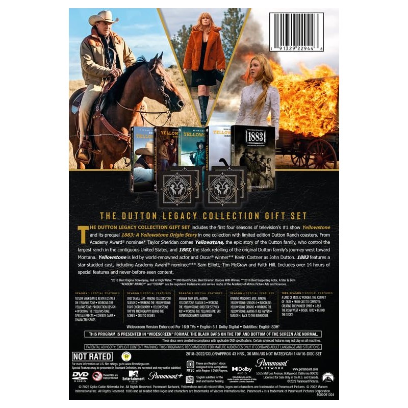 Yellowstone recounts the epic story of the Dutton family, who control the largest ranch in the contiguous United States. Headed by John Dutton (Academy Award? winner* Kevin Costner), the family faces an onslaught of attacks both from within and a world of vicious greed on the outside. 1883 is the hit prequel to the Emmy nominated drama Yellowstone. The limited series follows the Dutton family as they embark on a journey west. It is a stark retelling of Western expansion, and an intense study of one family fleeing poverty to seek a better future in America's promised land ― Montana. Yellowstone: The Dutton Legacy Collection includes the first four seasons of Yellowstone, 1883: A Yellowstone Origin Story and collectible Dutton Ranch Coasters packaged together in a Limited Edition giftset.