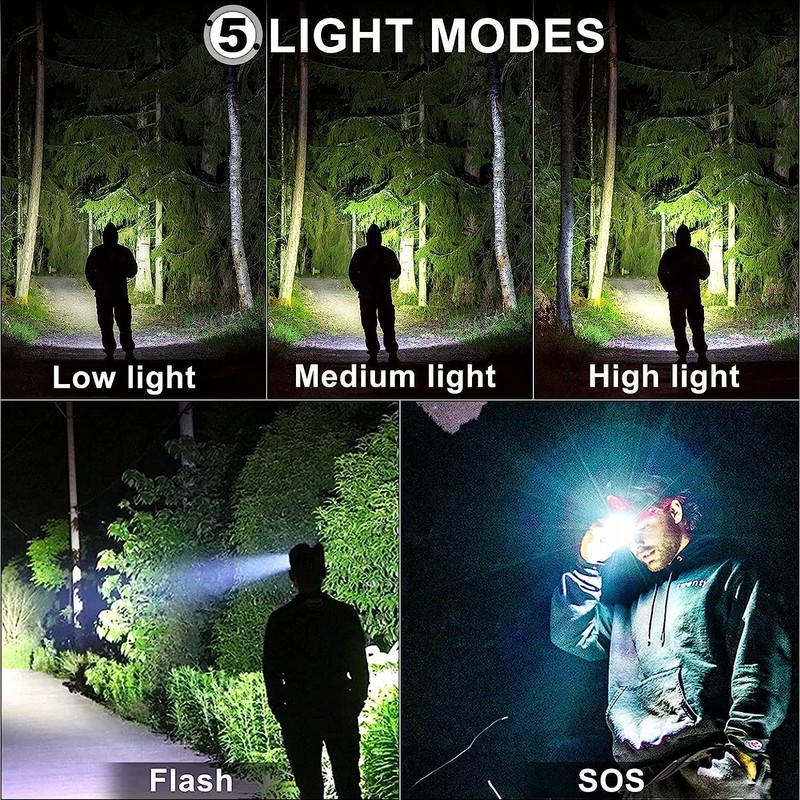 - 🔔【5 Lighting Modes】: The Powerful Head Torch comes with 5 lighting modes, including Hgh, Medium, Low, Strobe and SOS. Waterproof head torch makes it suitable for a wide range of activities, including camping, hiking, jogging, fishing, and more.