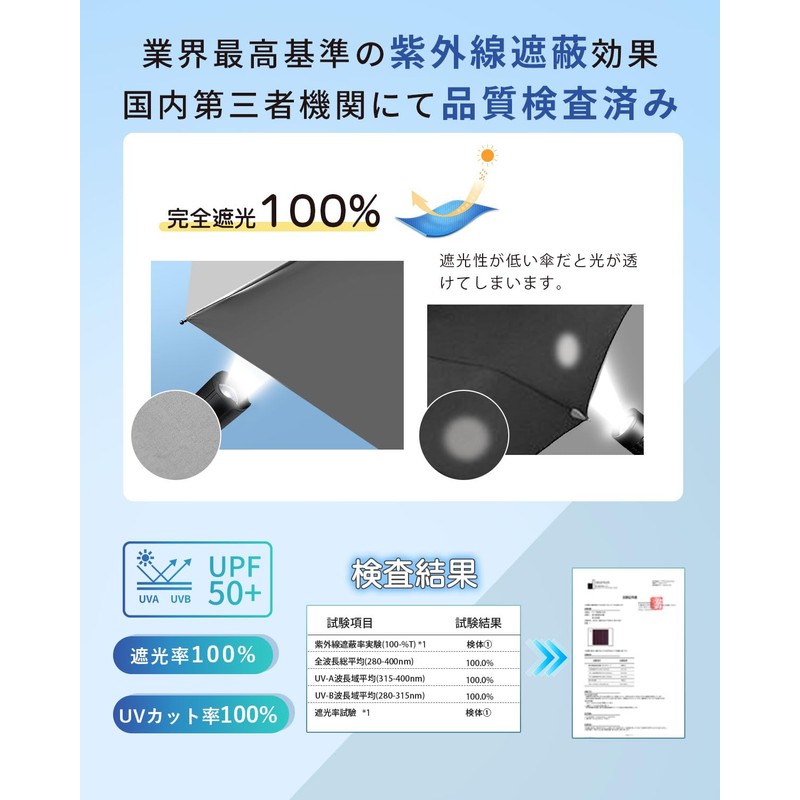 • The definitive UV protection. This folding umbrella is made with high density blackout material that meets JIS standards. It has over 99% UV protection and is safe for the sun in summer. It completely blocks UV rays from a wavelength of 380 nm. Heat shielding effects at temperature of -3 degrees F (-3 degrees C) to prevent burning