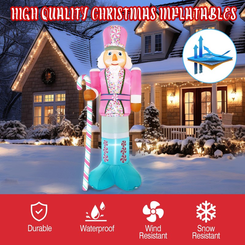 - 【Premium Quality & Safety】 The Christmas inflatable pink nutcracker features lightweight and weather-resistant polyester as well as a compact design, which is equipped with a built-in upgrade waterproof air blower with a UL-certified plug and it is also very safe for children. A must-choice for your Christmas yard inflatables