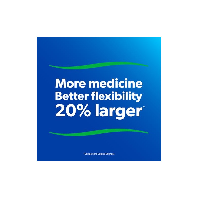 Salonpas Parche Analgésico es la solución número uno en ventas para el alivio del dolor localizado. Esta versión mejorada ofrece concentraciones más altas de sus tres ingredientes activos, proporcionando un alivio más potente y duradero. Con un tamaño un 20 % más grande que el original, está diseñado con un tejido suave, flexible y esquinas redondeadas para una mejor adhesión y comodidad durante el uso. Proporciona hasta 8 horas de alivio eficaz contra dolores musculares, lumbares, articulares o de cuello. Ideal para quienes buscan una alternativa sin pastillas para calmar el dolor.