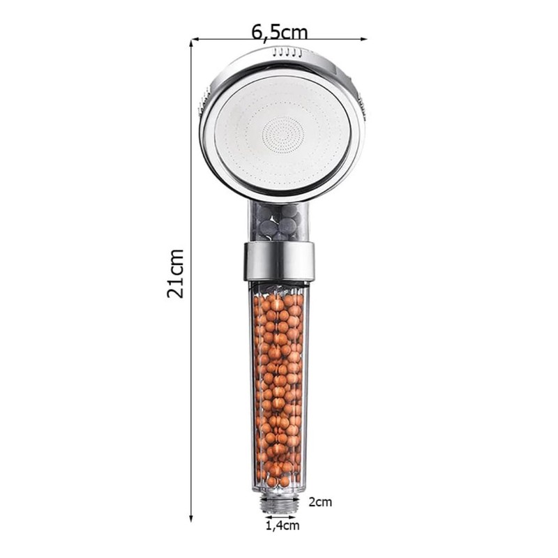 - Technical data/material: high-quality ABS plastic - Thread: 1/2 inch universal standard - Diameter of the shower head: 6.5 cm - Handle length: 21 cm - Functions: Rain jet, tourmaline infiltration, ionisation - Design: elegant, ergonomic and aesthetically pleasing