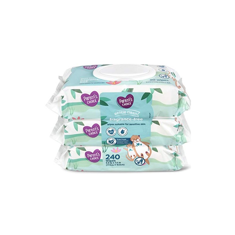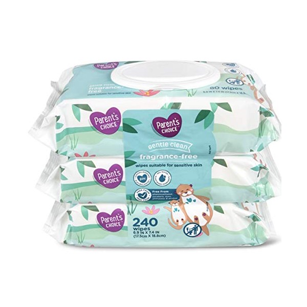 Parent's Choice Gentle Clean Fragrance-free Unscented No Scent Baby Wet Wipes Suitable for Sensitive Skin Infused with Vitamin E and Aloe, 240 Count (Value Pack Includes 3 80-Count Packages) - 1 Pack