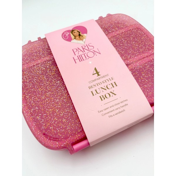 Keywords: Paris Hilton, lunch box, bento box, lunch container, food storage, pink glitter, 4 compartment, easy carry handle, school lunch, work lunch, picnic, meal prep, food container, kids lunch box