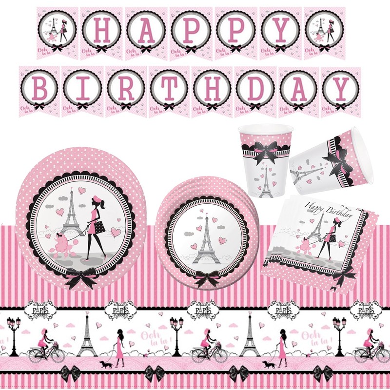 - Paris Party Pack Includes: 16 Dinner Plates 9" , 16 Dinner Plates 7", 20 Luncheon Napkins, 16 Cups, 9oz capacity, 1 Plastic Table Cover 54" x 102" (137cm x 259cm),1 Paris themed HAPPY BIRTHDAY banner.